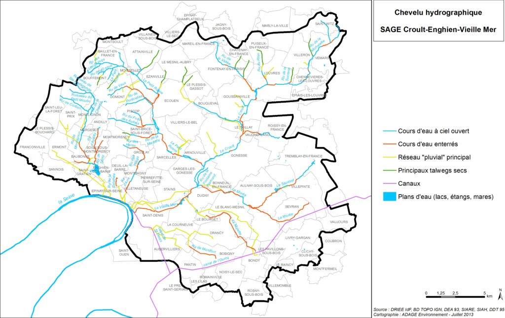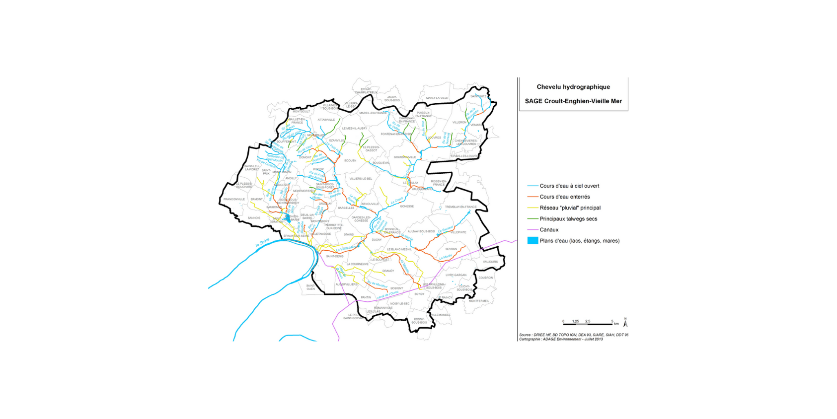 Le territoire du SAGE est parcouru par un réseau hydrographique historique de près de 150 km de long qui entaille plus ou moins profondément les calcaires de Saint-Ouen et les sables de Beauchamp. Ce réseau a pour exutoire la Seine au niveau des communes de Saint-Denis et d’Epinay-sur-Seine.